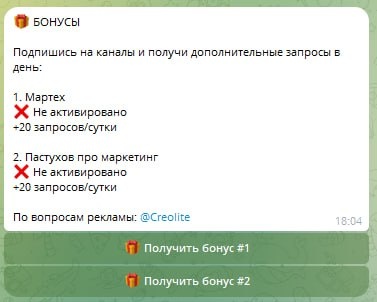 ? Таргет, посевы, реклама у блогеров - всё это бьёт по цене подписчика и раздувает бюджет, а результат непредсказуем. Платишь за показы, а канал почти не растёт. В некоторых нишах подписчик давно перевалил за 300-500 рублей и это считается нормой. 🔷 Конвертируем свою аудиторию в твоих подписчиков. В нашем GPT-боте есть раздел «Бонусы» — пользователи подписываются на твой канал и получают за это награду. А ты получаешь живых подписчиков - без слива бюджета. 🔷 Как это работает: - Выбираешь срок размещения 7 или 30 дней - Добавляешь бота в свой канал (нужно для отслеживания подписок) - Твой канал появляется в разделе бонусов уже на следующий день - По итогу, полная статистика: охват и количество новых подписчиков ⚠️ Мест всего 2 — размещение делаем только мы, самостоятельно не попасть. Хочешь быть в числе первых? Пиши нам в бота с пометкой «размещение в боте GPT» 😉