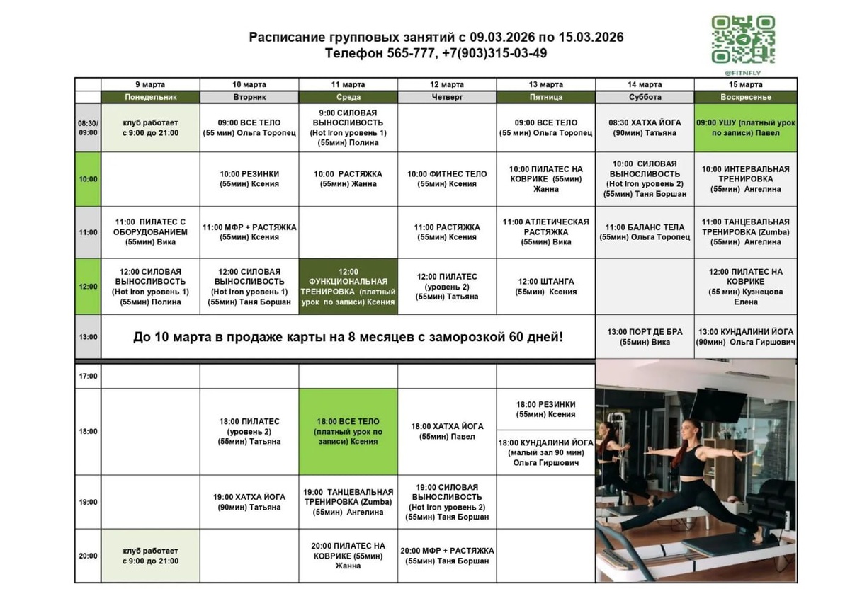 ⏩ Расписание групповых занятий с 09.03.26 по 15.03.26 Обратите внимание: 7, 8 и 9 марта клуб работает с 9:00 до 21:00. Студия фитнеса и пилатеса Волгоград, ул. Новороссийская, 5 Вход со двора 📱+78442565777 #FitNFly_расписание