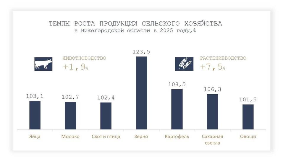 По итогам 2025 г. в Нижегородской области сельскохозяйственное производства выросло на 4,6% к уровню 2024 г. (в сопоставимых ценах). Объем сельхозпродукции (во всех категориях хозяйств) составил 168,3 млрд руб., сообщил заместитель губернатора региона Егор Поляков. По его словам, показатель по растениеводству в прошлом году увеличился на 7,5% к уровню 2024 г. в связи с ростом сбора и урожайности всех основных видов сельскохозяйственных культур. В 2025 г. в Нижегородской области стали больше собирать: Объемы продукции животноводства в регионе продемонстрировали рост на 1,9%. В том числе, увеличились производства: Ранее NN.DK.RU писал, что Нижегородской области направили 5 млрд руб. на поддержку АПК и сельские территории.