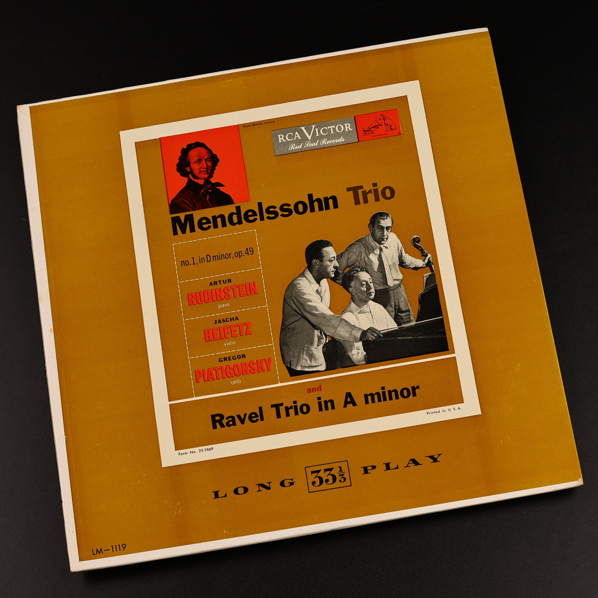 Я это называю «музейная копия», это настоящий Святой Грааль для коллекционера и винилового маньяка как я. Эти ранние Red Seal от RCA отличаются невероятной массой винила. Это тяжелый, жесткий, бескомпромиссный пластик. Глубокая канавка (Deep Groove) здесь такая, что в нее можно упасть и не выбраться, без шуток.) Обложка сохранила свой первозданный заводской вид, а этикетки на пластинках не тронуты,поэтому - это капсула времени и я буду слушать тот самый воздух, которым дышали эти титаны в студии. RCA Victor использовала для камерных записей начала 50-х либо Lotos Club (Нью-Йорк), либо Republic Studios Sound Stage (Голливуд), где акустика была сухой, но с невероятной разборчивостью. Поэтому я сразу представляю себе студию, она пропитанная дымом сигарет (все же курили, как паровозы) и три гения в одной комнате.