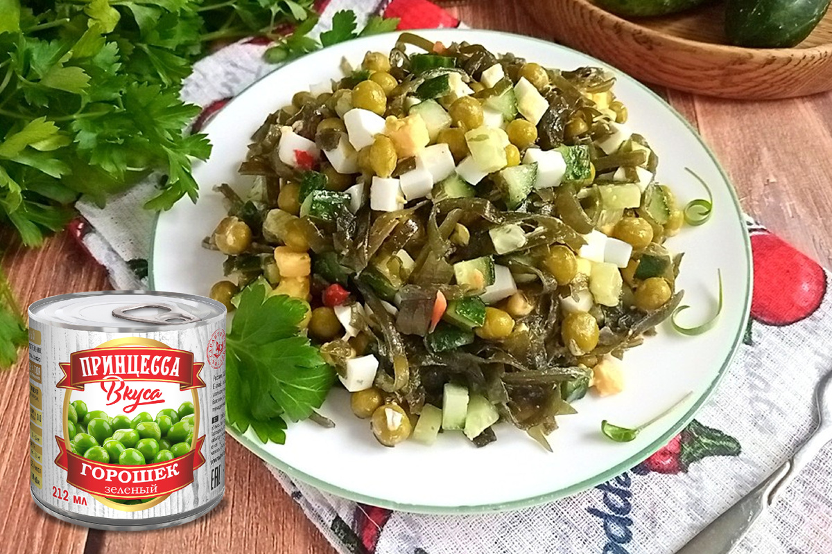 Кладезь витаминов в одной тарелке на вашем столе! Салат из морской капусты с яйцом и огурцом насыщен йодом благодаря большому содержанию этой полезной морской водоросли. Готовится он буквально за 10 минут. Салатом можно быстро перекусить или заменить им вечерний прием пищи. Морская капуста: 250 г Огурец «свежий): 1 шт. Зелёный горошек: 100 г Яйцо (вареное): 1 шт. Лук (зеленый): 10 г Майонез (можно заменить на растительное масло с лимонным соком): 3 ст. ложки Как сделать салат из морской капусты с яйцом, огурцом и майонезом? Подготовьте продукты. Капусту вы можете взять любую — уже готовую консервированную, на развес или сделать ее самостоятельно из сухих водорослей. Огурец возьмите средней величины или половинку крупного. Яйцо предварительно отварите и остудите. Майонез можно сделать самостоятельно. Сразу откиньте на сито капусту и зеленый горошек, чтобы в салат не попала лишняя жидкость. Огурец помойте, обсушите. Отрежьте кончик. Нарежьте огурец кубиками размером примерно с горошин