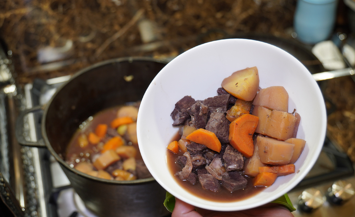 Говядина в вине! #рецепт Ингредиенты: ~1,5 кг говядины (мякоть бедра) 4 картофелины 2 морковки 3 лука 5-6 зуб чеснока 2 болгарских перца ~1 литр красного вина Специи: соль, чёрный перец, кориандр, веточки розмарина Приготовление: Для начала нарезаем говядина на небольшие кубики (у меня мясо подморожено, поэтому легче резать на кубики), сразу отправляем жариться в разогретую с растительным маслом кастрюлю(у меня чугунная), а пока мясо жарится занимаемся овощами; Лук нарезаем полукольцами, также нарезаем морковь, болгарский перец нарезаем произвольно, картофель нарезаем кубиком крупнее мяса; Как в кастрюле испарилась вся влага из мяса(у меня это заняло примерно 20 минут), добавляем лук, как лук начал становиться прозрачным, добавляем морковь, обжариваем еще пару минут и добавляем болгарский перец и давим туда чеснок с помощью чеснокодавки, обжариваем еще пару минут, затем добавляем сверху картофель и все специи включая веточки розмарина и заливаем вином (так чтобы почти все покрыло, как