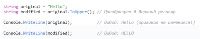 Когда мы говорим, что строки в C# неизменяемы, это означает, что любой метод или операция, которые "изменяют" строку (конкатенация, замена символов, перевод в верхний регистр), на самом деле создают новый объект строки в памяти. Исходная строка остается без изменений.