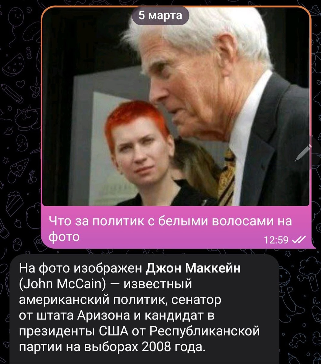 ? Ребус дня. 🧑🎓 Когда журналистка Анастасия Миронова (Глухова / Вельгус) ездила в США, чтобы выступить на запрещённом в РФ «Голосе Америки» ( https://t.me/anastasiamironowa/283 ) , где целых 15 минут поливала Россию грязью, она не только писала обращения Обаме и Макфолу с требованием запретить въезд депутатам Госдумы РФ в США ( https://t.me/anastasiamironowa/279?single ) 🤩Но и встречалась с немало именитыми дяденьками из конгресса. Работа нынче у агентов влияния такая. 🇺🇸 ИИ не может опознать этого дяденьку. Но каждый из нас его видел. Это слишком знакомое лицо... Давайте поможем мне разгадать эту загадку! Кто этот дедуля на фото, с кем встречалась наша воинственная борчиха с ВС РФ, Анастасия Миронова, в США? ПыСы: на фото не Маккейн и не Спектр. КТО ОН? 🔜Подписывайся! 😝МУРЧЕЛЛО КРЕМЛЯ