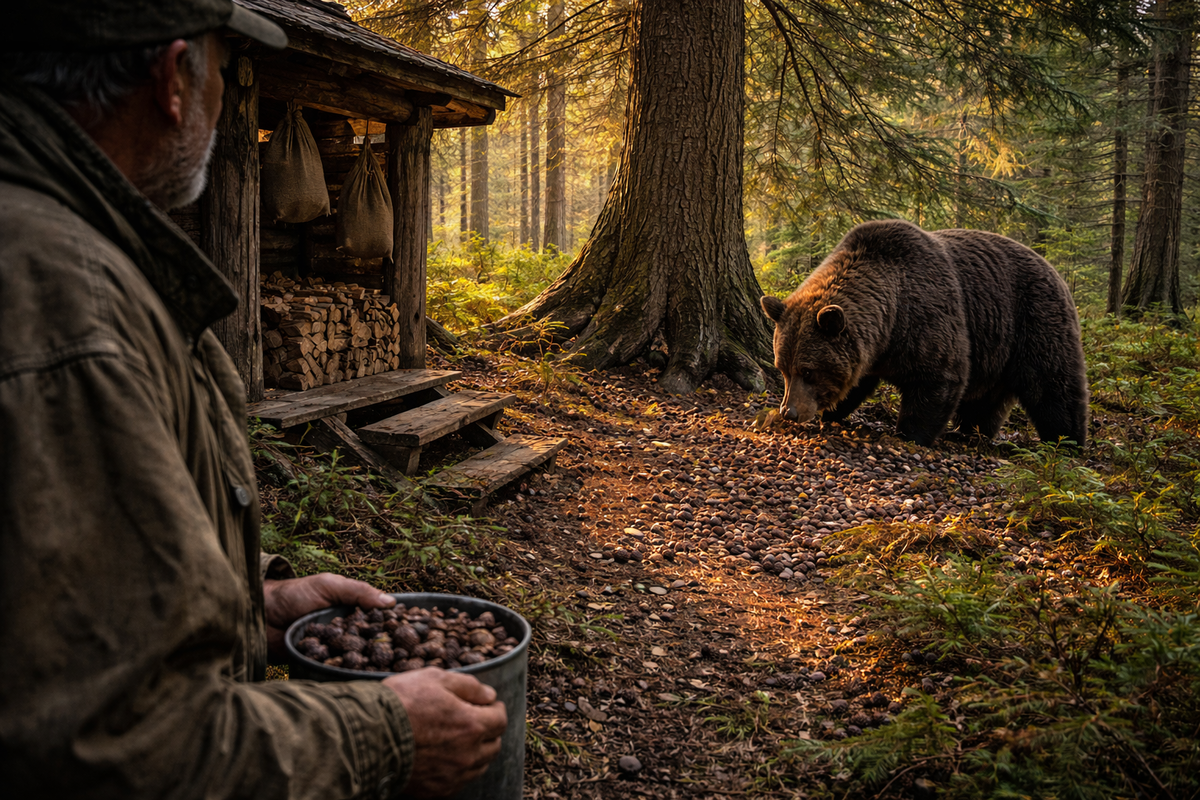 Глубоко в тайге, далеко от дорог и деревень, есть места, куда люди заходят редко. Иногда только охотники проходят там зимой по старым путикaм, а летом туда почти никто не добирается. Одно такое место находилось в огромном кедровнике, который тянулся на многие километры вдоль каменистой сопки и тихой таёжной речки. Кедры там были старые, толстые, некоторые стояли ещё со времён, когда в этих местах не было ни дорог, ни поселков. В самом центре этого кедровника стояла старая избушка. Небольшая, потемневшая от времени, с низкой крышей и маленьким окошком. Рядом был лабаз на высоких жердях, старый колун, воткнутый в чурку, и аккуратная поленница дров. В этой избушке уже много лет жил человек. Звали его Григорий. Когда-то он был обычным промысловиком, жил в деревне на большой реке, охотился зимой, рыбачил летом. Но со временем он всё чаще уходил в тайгу и всё дольше оставался там один. Потом построил избушку в кедровнике, и постепенно тайга стала для него единственным домом. Так прошло почт