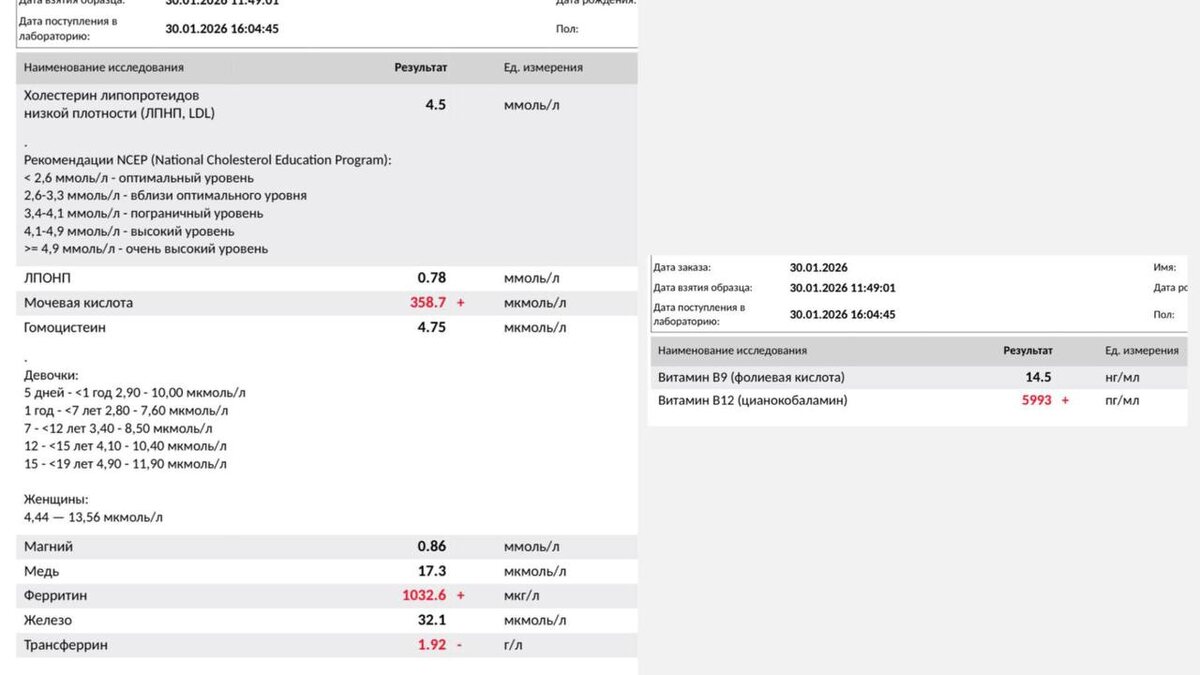IV‑терапия — ТОЛЬКО после анализов, особенно когда речь про железо. Шутки кончились.pmc.ncbi.nlm.nih+1 Смотрим анализы пациентки: Плюс воспаление, плюс повышенная мочевая кислота.