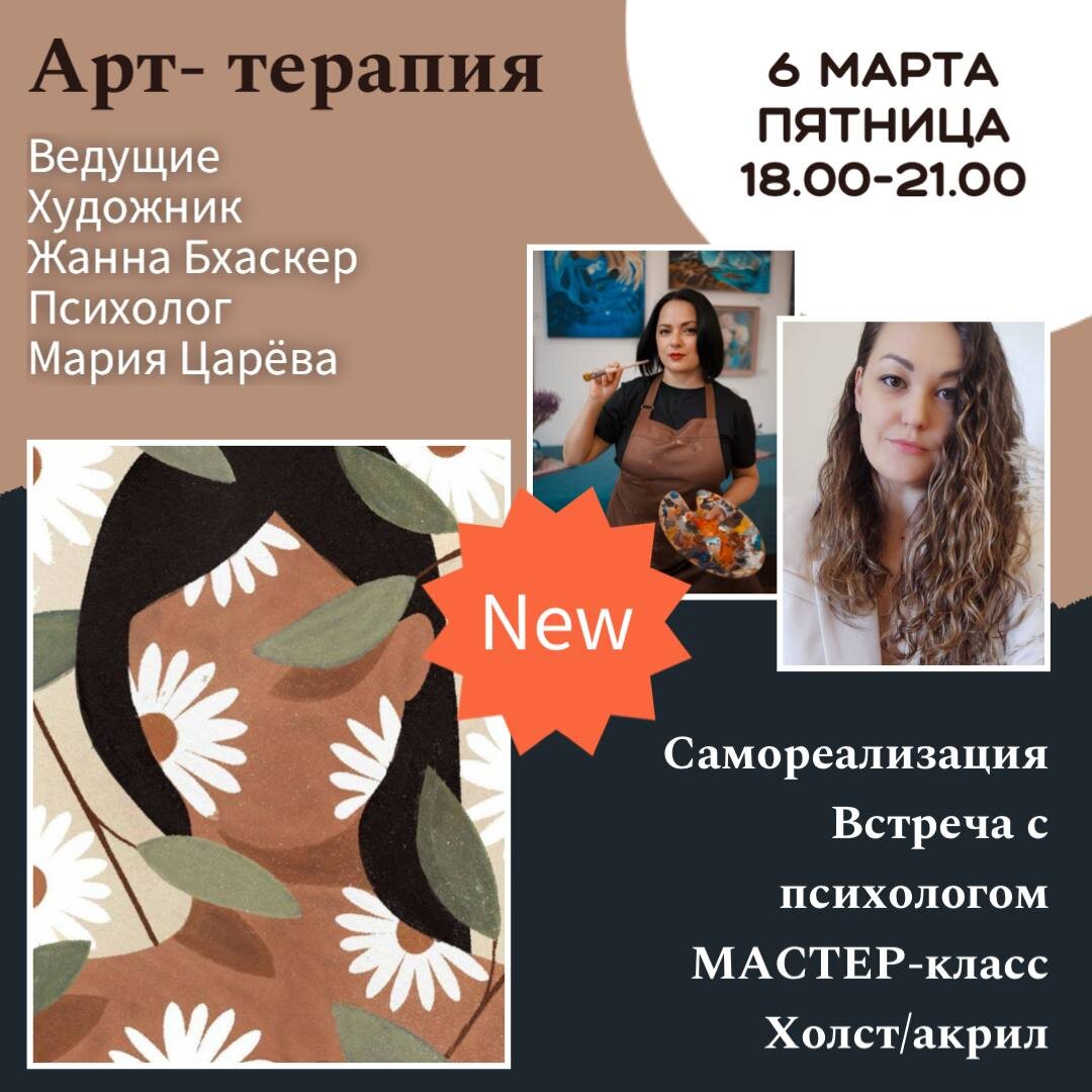 6 марта 2026г. состоится незабываемый вечер, посвященный женской самореализации: только девушки, свобода мысли, творческий полет и эмоциональный подъем в арт-студиичлена Профессионального союза художников России Жанны Бхаскер. Нередко под самореализацией понимают только карьеру. Но реализация самой себя может быть разной: в профессиональной сфере, в супружестве, в материнстве, в творчестве и не только! С практикующим психологом Марией Царевой мы обсудим: И, конечно, сделаем несколько психологических практик, чтобы найти искренние ответы на эти вопросы в глубине своей души. Предстоящее событие – это комплекс лучших психологических практик и художественный мастер-класс от выдающейся Жанны Бхаскер, которая мотивирует через рисование и вдохновляет творчеством, а еще поможет каждой из нас написать картину! Мы будем рисовать по образцу, но у каждой из нас получится свой результат, ведь все мы можем вносить коррективы в процесс создания картины, выбирать те или иные краски, выбирать свой путь