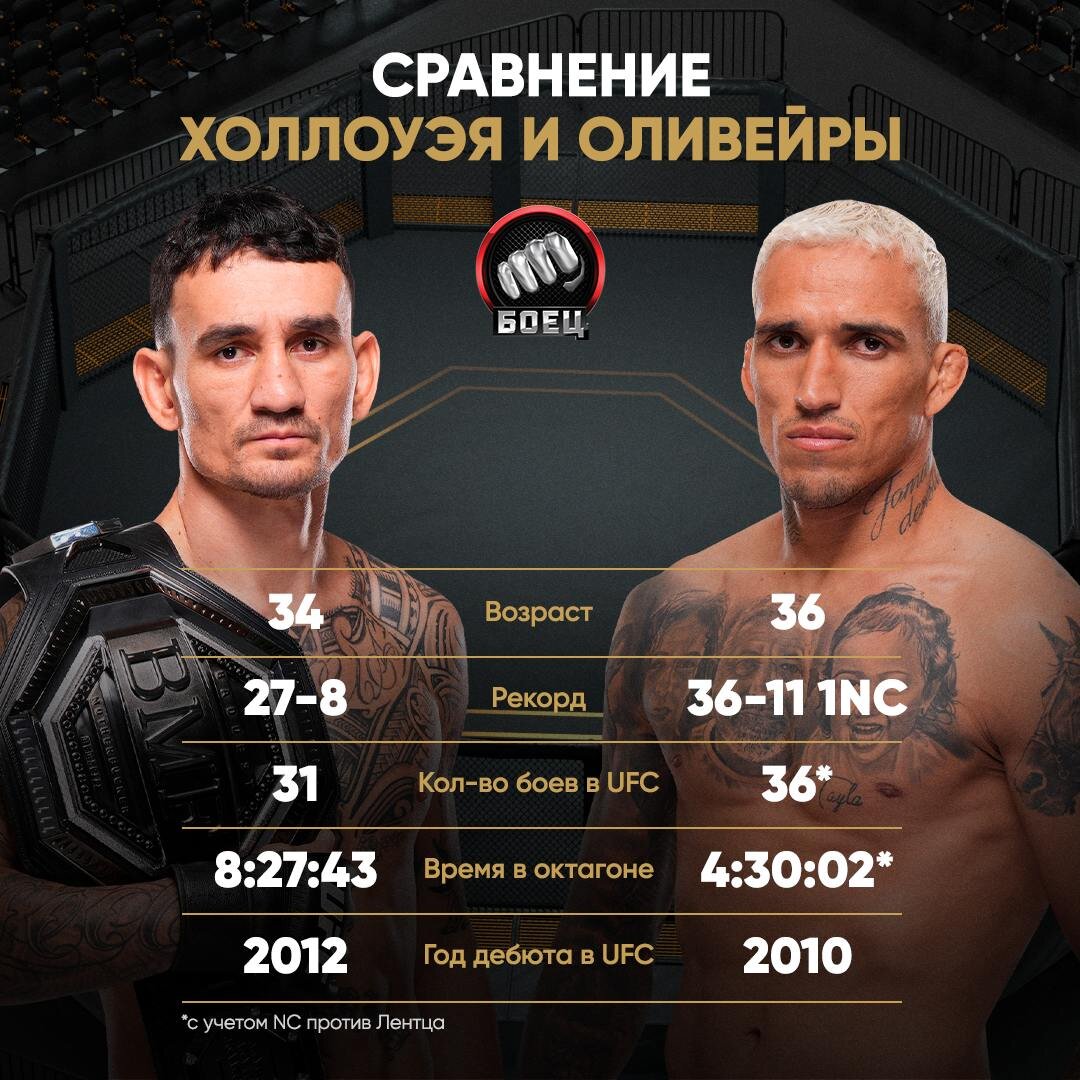 А как вам такое: почти 13 часов и 67* боев на двоих Холлоуэй и Оливейра провели в октагоне UFC 👀 И это при том, что у Чарльза 21 финиш, а у Макса – 13. Монструозная стата. В этом посте вспоминали статистику их первого боя.
