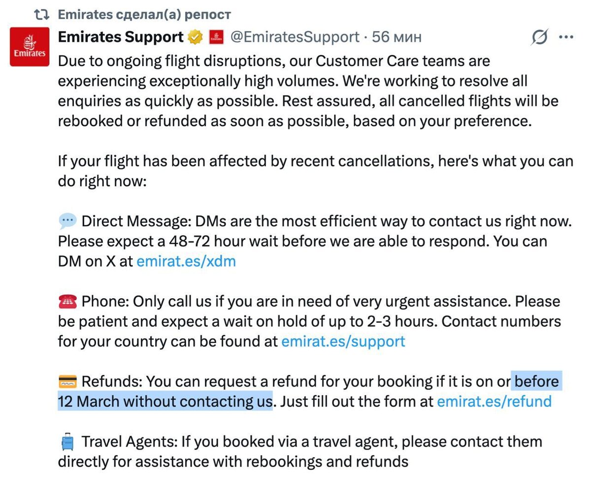 ! Продолжаем тему возврата российских туристов из ОАЭ с закрытым небом. ✈️ Авиакомпания Air Arabia уже выполнила 4 рейса из Шарджи в Россию 4 марта и планирует ещё 5 сегодня, но все с обязательной посадкой в Ташкенте, что увеличивает время в пути (расписание). 💸 Emirates разрешил оформить возврат полной стоимости билетов пассажирам, чей вылет был запланирован до 12 марта. 📝 Etihad Airways опубликовала детальные условия: переоформление билетов без штрафов возможно до 5 марта (подробности). 🛫 «Победа» успешно запустила новый рейс из Фуджейры в Махачкалу, и все билеты на рейсы 5 марта уже проданы. 🆘 #ОАЭ #авиаперелеты #туристы @takeyourbackpack