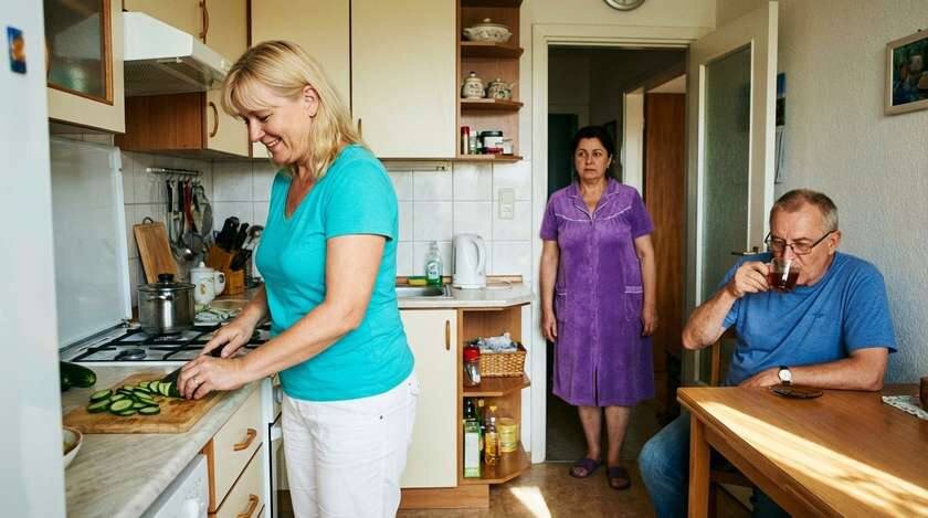 Картина, открывшаяся взору, выглядела почти домашней. У плиты стояла женщина лет пятидесяти пяти — стройная, в светлой блузке, с аккуратной укладкой. Она резала огурцы для салата. Володя сидел за столом с чашкой чая, улыбался и что-то рассказывал. На столе — две тарелки, хлеб, масло. Уютно. Слишком уютно.