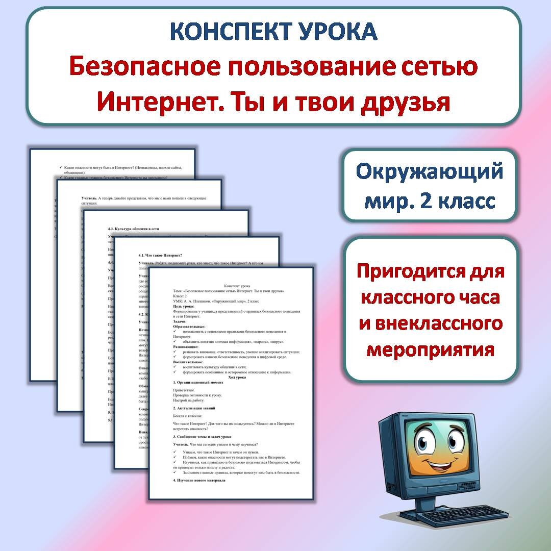 Конспект урока скачать здесь Презентацию к уроку скачать здесь Памятку для учащихся скачать здесь Конспект урока «Безопасное пользование сетью Интернет. Ты и твои друзья» разработан для урока окружающего мира во 2 классе. Так как данная тема очень актуальна в наше время (современные дети активно используют Интернет для общения, игр и поиска информации), эту разработку можно использовать для проведения классного часа или внеклассного мероприятия в 3 и 4 классах. Задачи: В разработке предусмотрены следующие этапы урока: 1. Организационный момент 2. Актуализация знаний и подведение к теме урока 3. Сообщение темы и задач урока 4. Изучение нового материала: 5. Закрепление изученного материала (практические задания). 6. Итог урока 7. Домашнее задание Методическая ценность разработки заключается не только в её содержании, но и в доступности формулировок для младшего школьного возраста. Желаю успеха!
