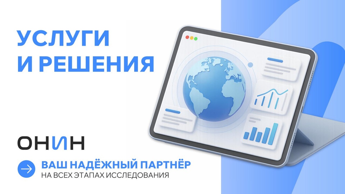 ● Сохраним ваши ресурсы и время для важного: делегируйте ОНИН задачи от программирования анкеты до обработки и анализа данных. ● Реализуем ваши индивидуальные запросы: доверьте ОНИН перевод, сложный программинг, нестандартные таблицы и другое. Услуги: ● Сбор данных по всему миру ● Программирование онлайн-анкет ● Профессиональный и адаптированный перевод ● Кодировка открытых вопросов любой сложности ● Расчёт таблиц по вашему ТЗ ● Специализированные статистические анализы Решения: ● Рекрут на UX и качественные онлайн-исследования ● Digital research ● Opronix для самостоятельного запуска опросов ● EasyTabs для создания таблиц любой сложности