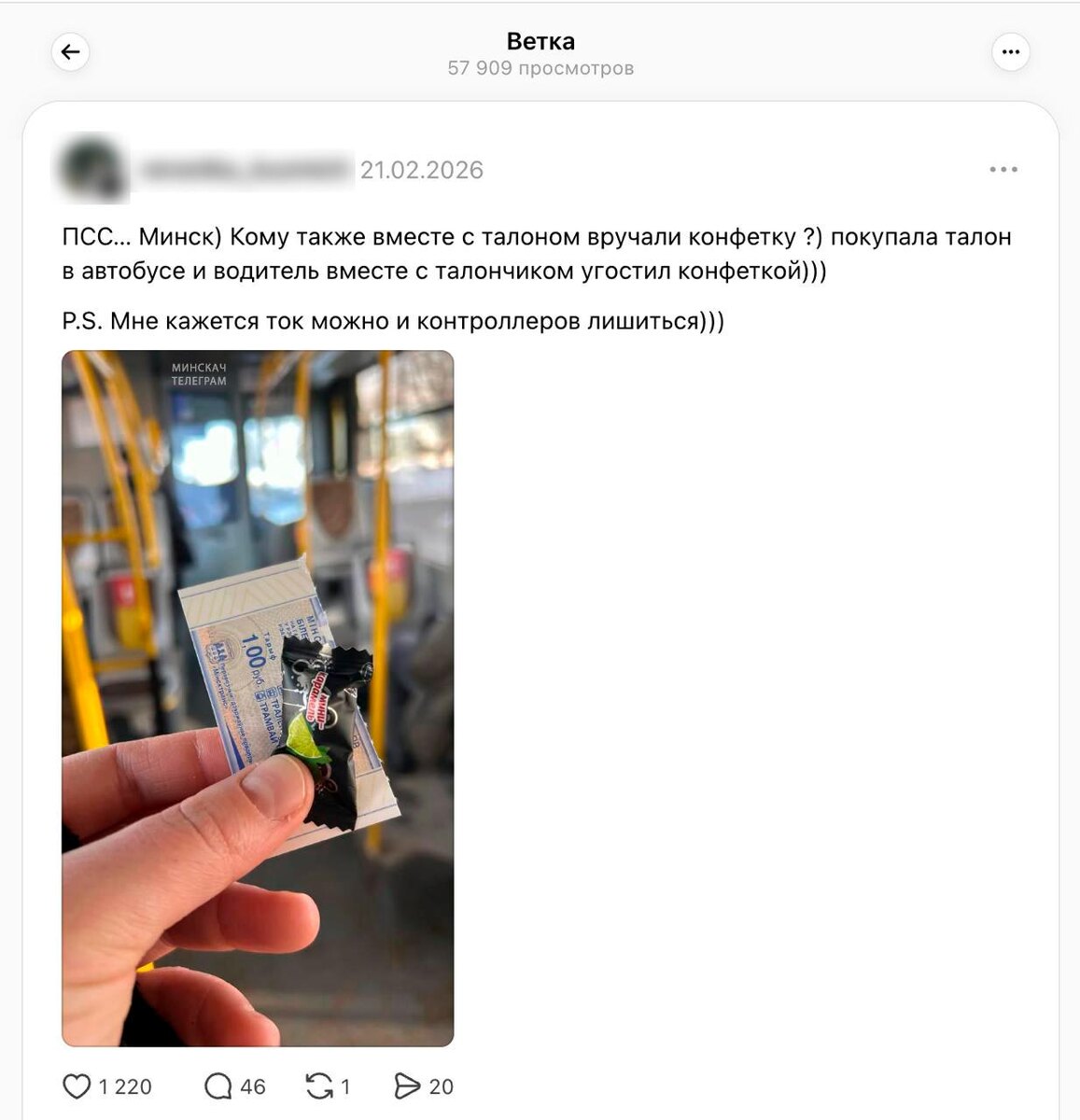 Минчанка рассказала, что при покупке талона в автобусе водитель вместе с билетом вручил ей… конфету.