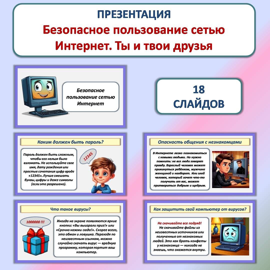 Презентацию скачать здесь Конспект урока (который вполне подойдет для беседы на классном часе) скачать здесь Памятку для учащихся скачать здесь Презентация «Безопасное пользование сетью Интернет. Ты и твои друзья» разработана для урока окружающего мира во 2 классе. Так как данная тема очень актуальна в наше время (современные дети активно используют Интернет для общения, игр и поиска информации), эту разработку можно использовать для проведения классного часа или внеклассного мероприятия в 3 и 4 классах. Задачи презентации Презентация состоит из 18 слайдов. Данная методическая разработка — удобный и понятный материал не только для педагогов и воспитателей, но и для родителей. Опираясь на её содержание, легко организовать профилактическую беседу об опасностях, которые могут подстерегать человека в интернете. Текст написан простым и понятным языком, слайды не перегружены информацией. Красочные иллюстрации помогут оживить беседу, вызовут интерес у детей, включат зрительную память и будут