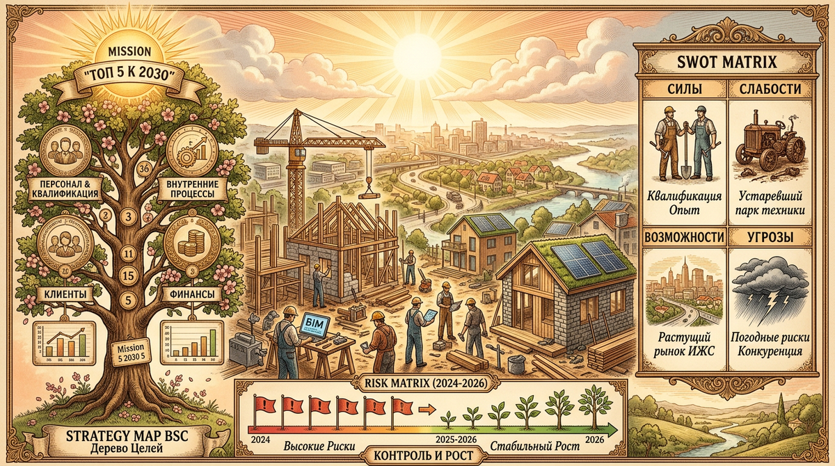 В 2026г. строительная отрасль кипит: инфляция на материалы +10-15%, дефицит квалифицированных кадров, ужесточение регуляций по экологии и цифровизации. Многие компании хватаются за любой заказ, экономят на всём подряд и надеются на «завтра будет лучше». Однако реальность в строительстве говорит: без чёткой стратегии — неизбежный спад! 📉🚨 Предпосылки спада: подрядчики и поставщики подводят, уход клиентов к конкурентам с цифровизацией, знакомые компании всё чаще говорят о снижении рисков от банкротства. Выход — «стратегия» — она превращает хаос в рост на 20-25%, даёт преимущество над «реактивными» игроками. Разберём по шагам: зачем нужна стратегия, как её формировать, внедрять и контролировать. Это гид из реальной практики для директоров строительных компаний и проектных бюро! Зачем стратегия строительной компании в 2026г? 🎯 Стратегия — не роскошь, а необходимость выживания в текущей ситуации строительной отрасли, она решает ключевые боли: 🔹Конкурентные преимущества: анализ рынка пом