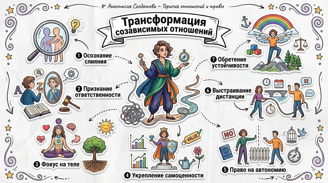 Происходит понимание, что невозможно контролировать чужие эмоции ради собственного спокойствия. В терапии мы работаем над возвращением контроля над сво