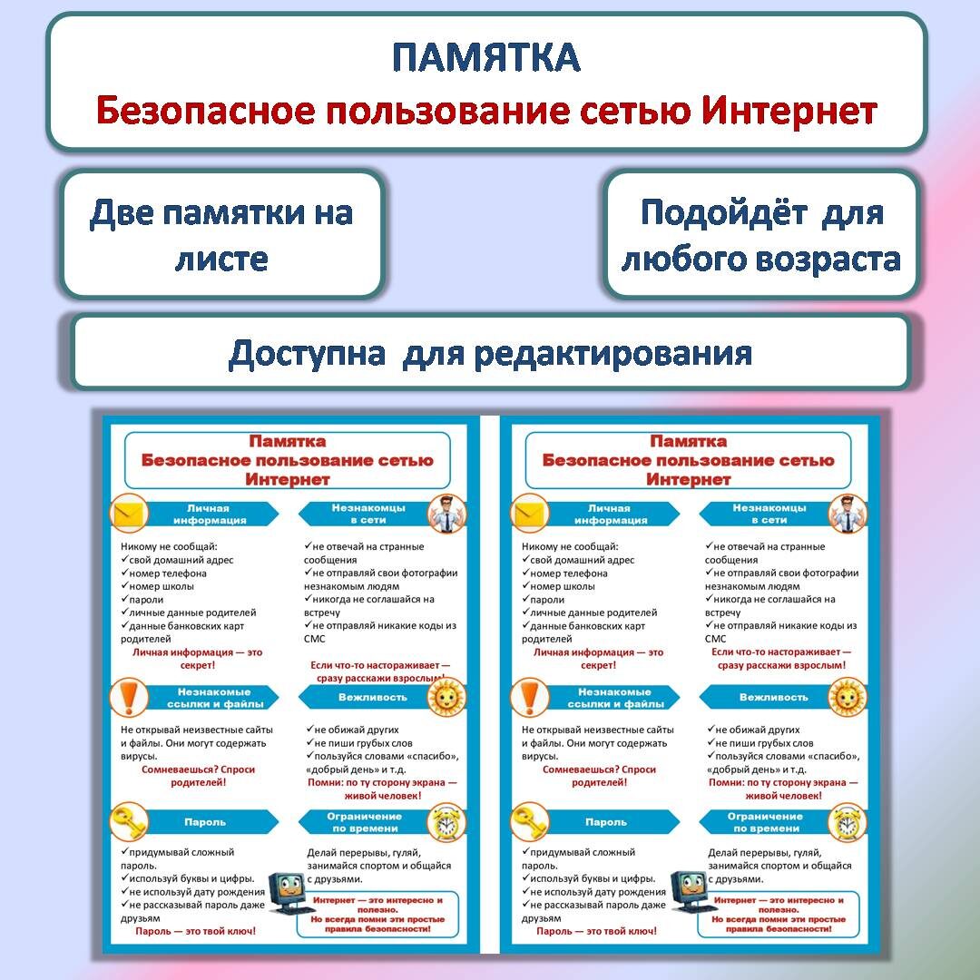 Памятку скачать здесь Памятка «Безопасность в сети Интернет» разработана для обеспечения безопасности детей и подростков в сети Интернет. Данная тема очень актуальна в наше время, т.к. современные дети активно используют интернет для общения, игр и поиска информации, не всегда заботясь о своей безопасности. Целевая аудитория и время использования: Памятка адресована непосредственно детям и подросткам в возрасте от 7 до 17 лет, а также их родителям и законным представителям. Обсуждение и распространение памятки возможно на уроках, классных часах, внеклассных мероприятиях и родительских собраниях. Краткое содержание и ключевые положения: Памятка нацелена на формирование у детей и подростков осознанного отношения к собственной безопасности и безопасности членов своей семьи. Данная памятка — удобный и понятный материал для педагогов, воспитателей и родителей. Опираясь на её содержание, легко организовать профилактическую беседу об опасностях, которые могут подстерегать человека в интернете