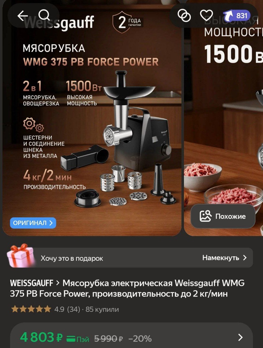 Мясорубка электрическая Weissgauff WMG 375 PB Force Power, производительность до 2 кг/мин