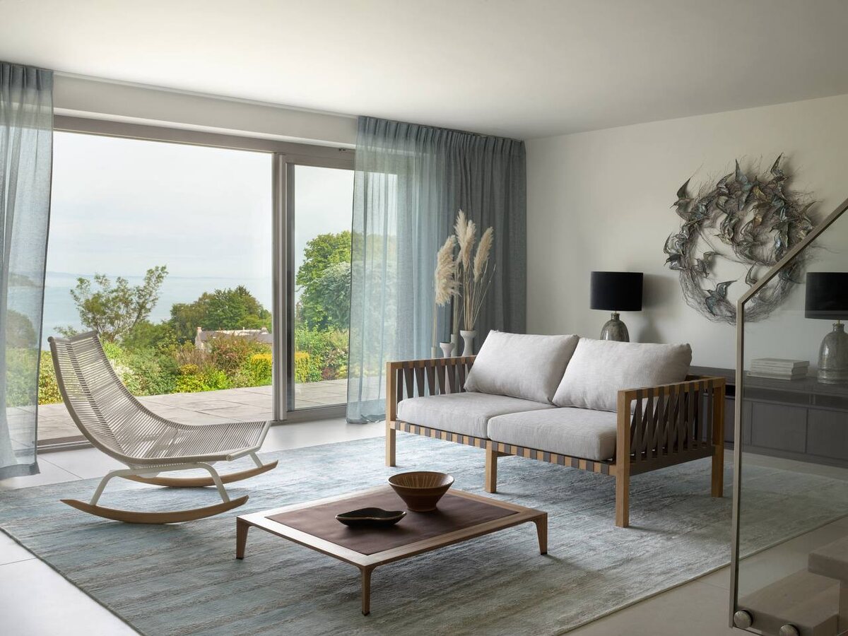 За годы работы проекты бюро Олега Клодта появились далеко за пределами России — в Лондоне, Девоне, Амстердаме, Люцерне, Ташкенте, Барселоне и Баку. Каждый новый город — это всегда другой ритм, другой свет и другая история дома, которую важно почувствовать прежде, чем начинать работать с пространством. Дом на побережье Девона, например, буквально вырос из пейзажа. Из панорамных окон открывается вид на юрское побережье, и интерьер родился из этих ощущений: мягкие серые и румяно-розовые оттенки перекликаются с цветами песчаных пляжей и прибрежных скал. Пространство словно продолжает окружающую природу и растворяется в ней. Квартира в Лондоне — совсем другая история. Она создавалась для молодой семьи, живущей между Монако и Великобританией. Центром стала большая гостиная открытой планировки, объединяющая кухню, столовую и кабинет. Интерьер строился вокруг привычек и ритма жизни владельцев — с домашней библиотекой, светлым пространством для занятий йогой и удобными зонами для семейной жиз