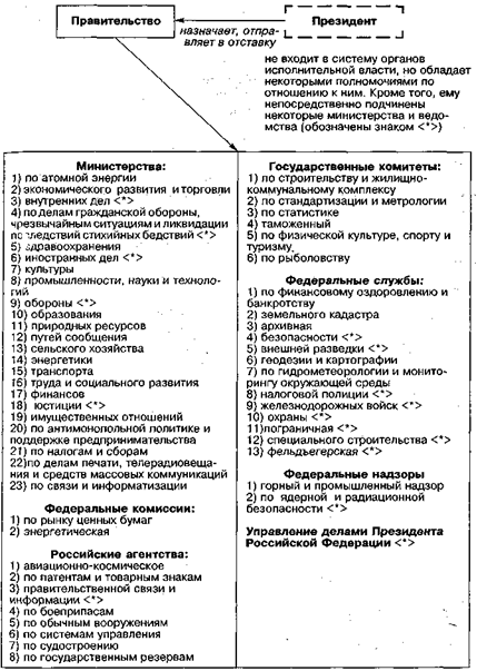 Система федеральных органов исполнительной власти. Она включает в себя Правительство, министерства и ведомства (государственные комитеты, федеральные службы и т. д.) (рис. 1). Президент не входит в систему федеральных органов исполнительной власти.