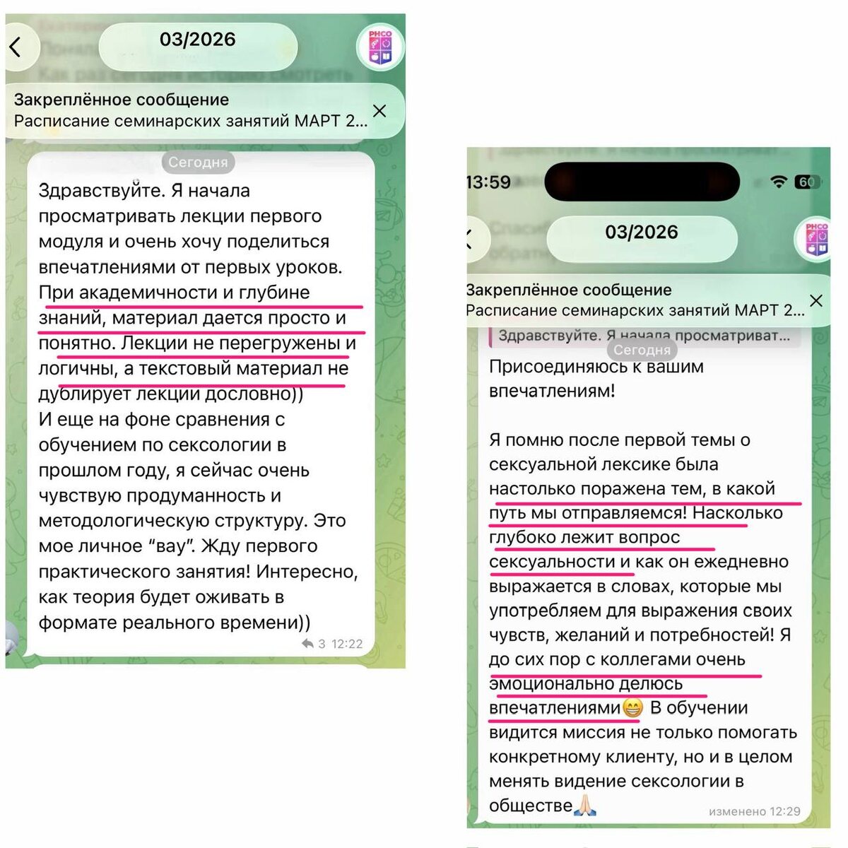 🤩 2 марта стартовала новая группа программы «Психологическое консультирование в сексологии». Студенты делятся первыми впечатлениями. Посмотрите на скрины из чата выше ⬆️ Это только первые лекции, практические занятия ещё не начались. В эту субботу у группы стартуют практические семинары, а ведь на практике происходят самые сильные инсайты. Вы ещё успеваете присоединиться, чтобы через год закончить обучение с дипломом на руках, а не наблюдать за результатами других. Если давно думали о профессиональном обучении в области сексологии — сейчас идеальный момент. Присоединяйтесь к группе ✨ Подать заявку в приёмную комиссию @universitet_rnso Канал Университета РНСО в Max