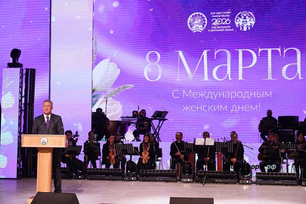 5 марта в уфимском конгресс-холле «Торатау» прошло торжественное мероприятие, посвященное Международному женскому дню. «Хөрмәтле ҡатын-ҡыҙҙар! Иң матур байрам менән ҡотлайым һеҙҙе! Дорогие женщины! Искренне от души поздравляю вас с красивым праздником Весны и Любви — Международным женским днем! К этому празднику у нас всех особое, трепетное отношение. Этот тот день, когда нужно со всей искренностью говорить самые важные, главные слова. В этот праздник мужчины спешат сказать вам, дорогие женщины — мамы, жены, бабушки, дочери, сестры, подруги, коллеги — как сильно мы вами дорожим. Как нежно вас любим и ценим. Говорят, что время расставляет свои акценты и меняет буквально все — технологии, устои и ритм жизни, даже привычки. Но есть то, что было, есть и будет незыблемым, как сама жизнь. Это ваша, дорогие женщины, самая высокая миссия на земле. Ваша роль в рождении и воспитании детей. Ваше место в нашем сердце. Сегодня время предъявляет особые требования к каждому из нас. Но вы умудряетесь