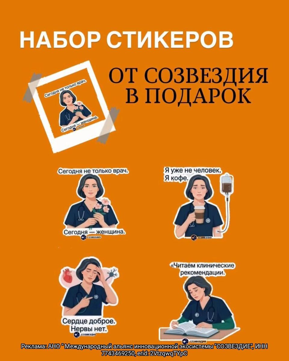 💙💙💙💙💙💙💙 Срочно переходите по ссылке, пока не началось! (Или пока не позвали на обход). ⚡️ Это срочно или как обычно срочно? ⚡️ Я уже не человек. Я кофе. ⚡️ Сердце доброе. Нервы нет. ⚡️ Я жду. Если вы врач, вы точно слышали или говорили это сегодня. Поэтому мы сделали то, что давно должно было появиться в медицинских чатах - Telegram-стикер-пак «Созвездие: доктор, женщина, характер». Это озвучка нашей с вами жизни. Мы собрали в одном месте всё: от профессионального цинизма до моментов, когда хочется поддержать уставшую коллегу Иногда один стикер говорит за врача лучше, чем десять сообщений. Что вас ждёт внутри: 👑 Фразы с характером, для тех моментов, когда слова не нужны, а нужен взгляд. 😈 Профессиональный юмор, который поймут только свои. 💛 Поддержка коллег, чтобы сказать «Держись!» без лишних сантиментов. 🌷 Отдельный блок к 8 марта, потому что мы не только врачи, но и женщины. Этот набор быстро станет любимым в медицинских чатах. Теперь не нужно будет искать слова