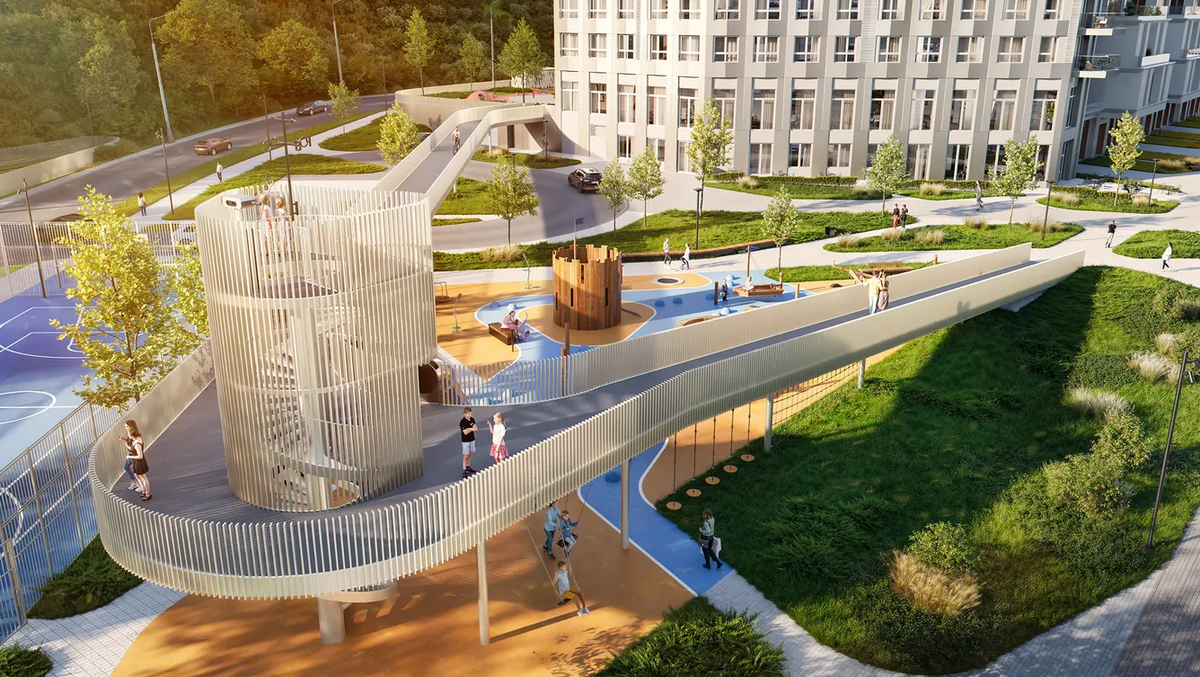 Двор современного жилого комплекса давно перестал быть просто территорией между домами. Это полноценное пространство для жизни, общения и отдыха, где каждая деталь продумана с учетом потребностей жителей. Современные тренды благоустройства Застройщики стремятся сделать пространство не только красивым, но и функциональным. Для этого существует множество решений. Основные направления благоустройства, которые сегодня можно встретить в новых жилых комплексах: Неповторимая атмосфера двора в ЖК «Фордевинд» Комплекс, который строится на Черниговской набережной, предлагает новый подход к организации дворового пространства. Его главное отличие от других проектов кроется в уникальном расположении на первой береговой линии Оки и смелой архитектурной концепции. Архитекторы бюро «Мегабудка» и Plombir создали проект, где природа и городской дизайн гармонично взаимодействуют между собой. Что же делает двор ЖК «Фордевинд» особенным и непохожим на другие? Давайте посмотрим вместе: Двор ЖК «Фордевинд» с