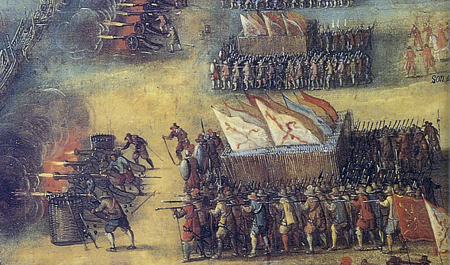 Новое оружие требовало и новой пехоты. Испанцы взялись за эту задачу всерьез. Старый аркебуз превратился в мушкет — тяжелое ружье калибром до двадцати трех миллиметров, длиной до полутора метров с лишним, весом от восьми до десяти килограммов. Пуля в пятьдесят-шестьдесят граммов пробивала самые толстые латы на расстоянии двухсот-трехсот метров. Стреляли обязательно с сошки — острого шеста с развилкой наверху. Без нее оружие было не удержать. Фитильный замок, деревянный шомпол. Скорострельность низкая, а во время заряжания стрелок оставался беззащитным. Два вопроса мучили командиров: как обеспечить хоть относительную непрерывность огня и как прикрыть мушкетеров от атак.