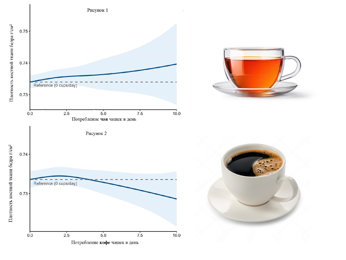 1) При одновременном употреблением кофе и алкоголя плотность костей снижалась быстрее. 2) Употребление чая оказалось полезным при повышенном весе.