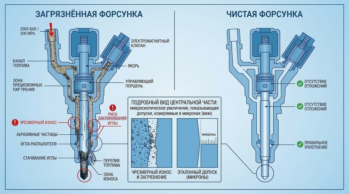 Ремонт одной форсунки Common Rail — от 5 000 до 15 000 рублей. Ремонт ТНВД — от 10 000 до 30 000. А если запустить, может понадобиться и то, и другое. Дизельная топливная система — самая дорогая в обслуживании и самая чувствительная к качеству топлива. Но часто проблему можно решить без поездки на сервис и без снятия форсунок — промывкой через бак. Рассказываем, почему дизель особенно боится грязного топлива, как распознать загрязнение и как провести очистку самостоятельно. Бензиновая форсунка работает при давлении 3–5 бар. Дизельная в системе Common Rail — при давлении до 2 000 бар. Это в 400 раз больше. При таком давлении даже микроскопические частицы загрязнений действуют как абразив — стачивают запорные иглы форсунок и клапаны ТНВД. Допуски в дизельных форсунках измеряются микронами. Малейший налёт на игле — и форсунка теряет герметичность, начинает «переливать» или, наоборот, недодавать топливо. Отсюда — чёрный дым, потеря тяги и перерасход. А ещё несгоревшее топливо из грязных ф