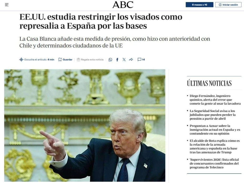 Администрация США рассматривает возможность введения визовых ограничений в отношении Испании в ответ на отказ Мадрида предоставить свои военные базы для ударов по Тегерану. Об этом сообщает ABC со ссылкой на информированный дипломатический источник. По данным издания, Вашингтон планирует использовать визовую политику как инструмент прямого политического давления. «Для отказа в визе не обязательно наличие судебного приговора, администрация может действовать исходя из политических критериев или соображений безопасности в рамках своих миграционных полномочий» — говорится в материале ABC. Источники отмечают, что ограничения могут коснуться как конкретных должностных лиц, так и более широких кругов, при этом не затрагивая напрямую экономические отношения между странами. Ранее мы писали, что Премьер-министр Испании Педро Санчес жестко раскритиковал Дональда Трампа.