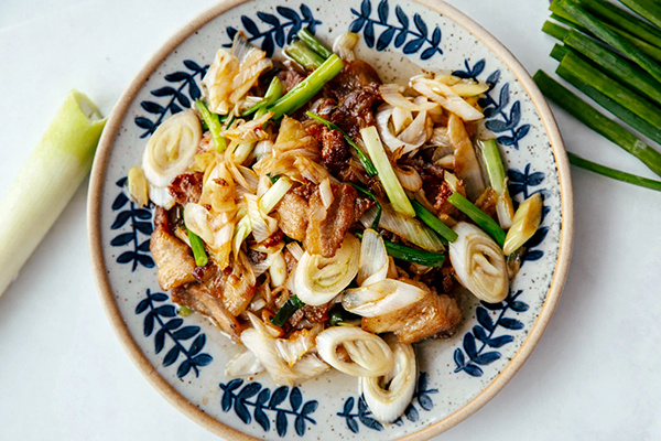Есть блюда, которые готовятся не «по настроению», а по запаху. Вы ещё только режете имбирь, а кухня уже ведёт себя так, будто в ней открыли маленький северокитайский ресторан. Эта жареная свиная грудинка с зелёным луком — как раз из таких. Без маринада, без сложных соусов, без чили-пожара (да, бывает и так). Вся магия — в правильной обжарке и в луке, который не превращают в тряпочку. Свиная грудинка жирнее большинства кусков, поэтому её часто «балансируют» перцем и мощной ароматикой. Но у северных китайских блюд есть любимый ход: взять крупный китайский лук Дацун (大葱), он даёт блюду правильный баланс: сладость, резкость и плотный хруст. Но если его не найти — берите лук-порей: по текстуре и вкусу это самая близкая замена. Главное — используйте белую часть. Получается неожиданно гармонично: жирность грудинки не давит, а становится «шёлковой», потому что лук работает как противовес. ароматика и приправы Нарезаем грудинку тонко Если тонко нарезать сложно — положите грудинку в морозилку на
