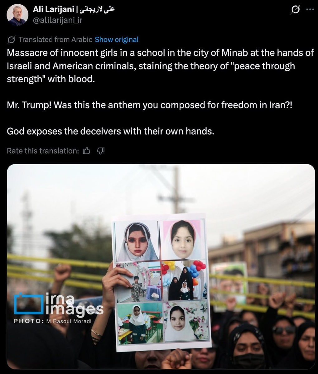 ‘Massacre of innocent girls in Minab stains the theory of peace through strength with blood’ — Ali Larijani, Secretary of Iran’s Security