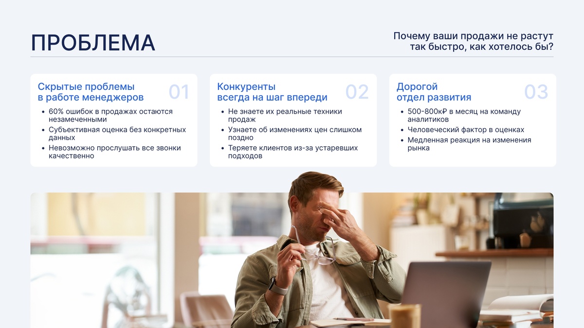 1️⃣ Вы работаете вслепую. 60% ошибок менеджеров проходят мимо вас. Почему? Потому что физически невозможно прослушать все звонки качественно. А субъективная оценка «на глаз» — это не аналитика, это гадание.