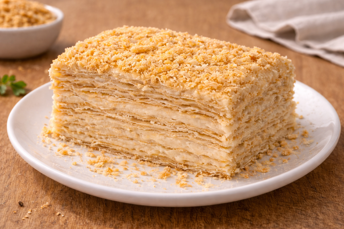 Я готовлю этот торт, когда нужен классический десерт без яиц и молочных продуктов. Коржи получаются тонкие, хрустящие, слоёные. Крем — мягкий, нежный и хорошо пропитывает тесто. В результате торт держит форму и легко режется. Для коржей: мука — 500 г, холодная вода — 200 мл, растительное масло — 120 мл, соль — щепотка, уксус — 1 ч. л.