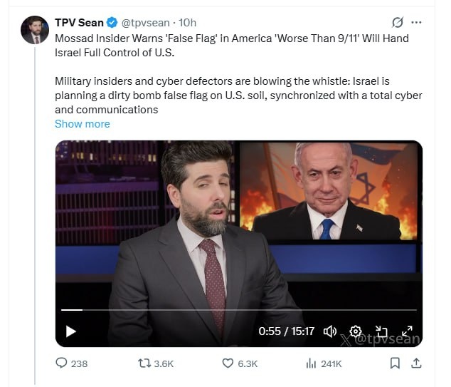 🚨 Источник в Моссаде предупреждает о подготовке Израилем крупномасштабной операции под ложным флагом на территории США, которая, по его словам, может превзойти по масштабам 11 сентября. Цель — возложить вину на Иран. 💥 Эта операция призвана запугать население США и подтолкнуть страну к началу Третьей мировой войны. Предполагается, что может быть использована "грязная" ядерная бомба. #ОперацияПодФлагом #ТретьяМировая °Telegram • Zen • Bastyon° ✒️Предложить новость