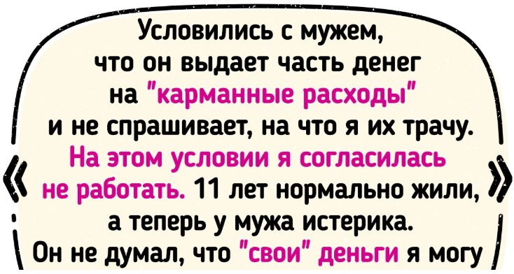 - Условились с мужем, что он выдает часть денег на «карманные расходы» и не спрашивает, на что я их трачу. На этом условии я согласилась не работать. 11 лет нормально жили, а теперь у мужа истерика. Он не думал, что «свои» деньги я могу не тратить, а позаботиться о своей же безопасности. Я купила две квартиры. Купила так, что в случае развода делить мы их не будем. О разводе не думаю, просто включаю мозг.