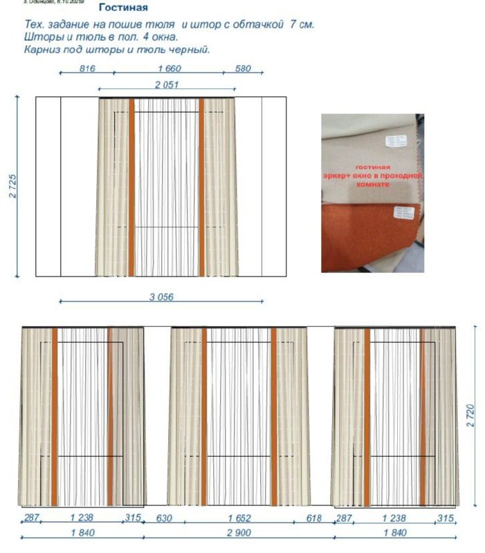 Так выглядит у нас тех.задание с размерами и материалами на пошив штор и тюля