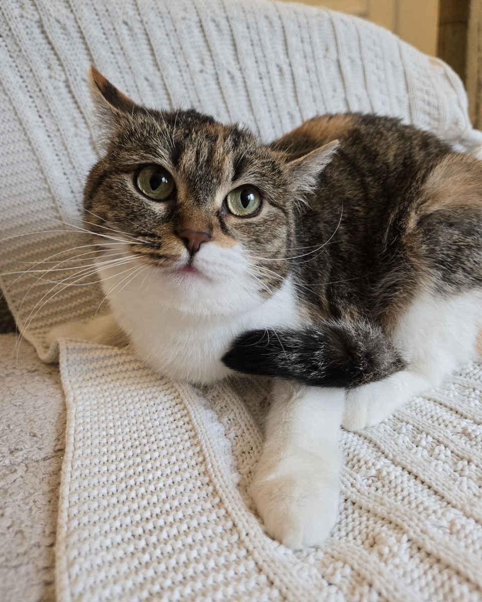 Картошечка — метис шотландца или британца, круглоглазая красотка трехцветного окраса. Картошку спасли с улицы, сейчас она живет на передержке и ищет дом.