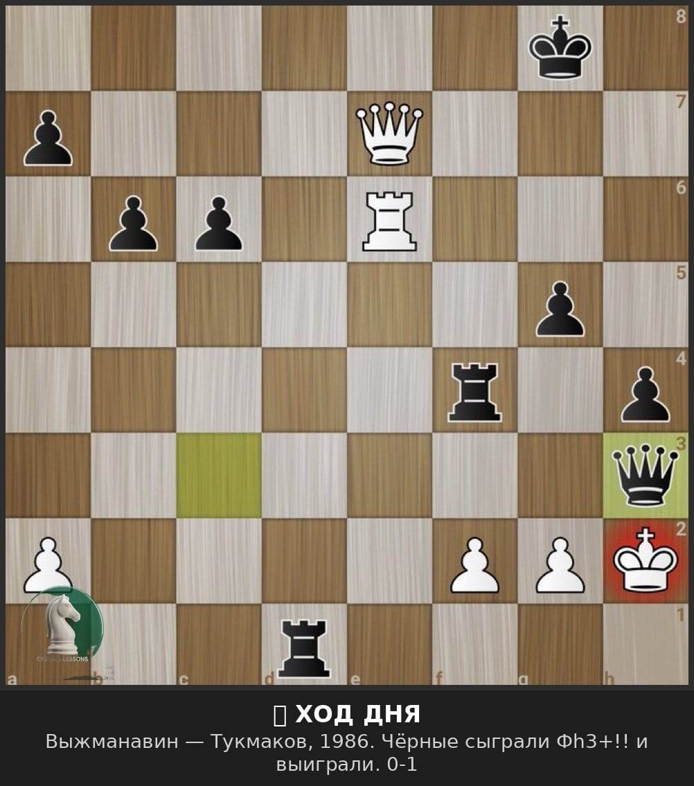 Чёрные сыграли Фh3+!! — блестящий шах ферзём, после которого белые не могут избежать мата или катастрофических потерь. 0-1