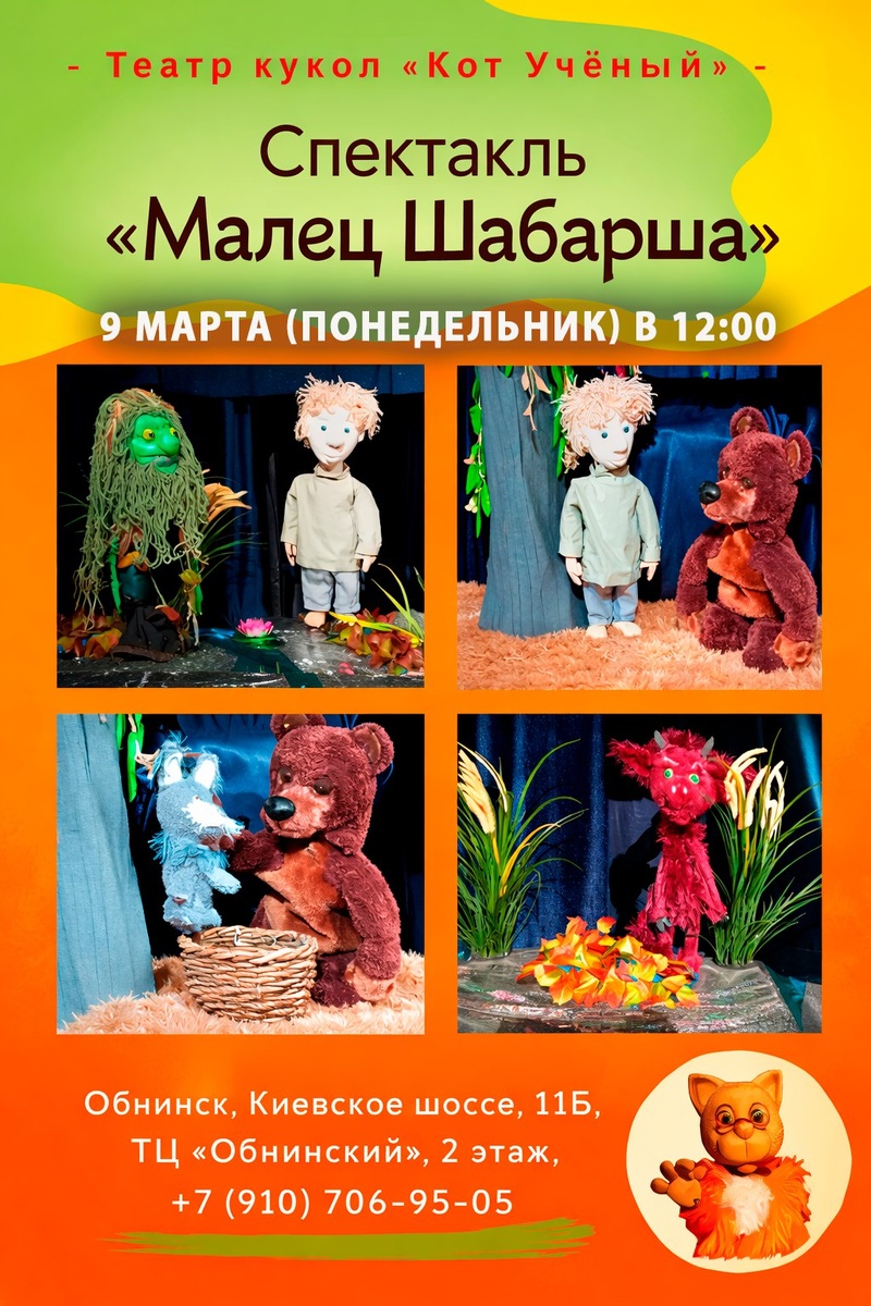 +): 🗓9 марта (понедельник) в 12:00 По мотивам русской народной сказки «Шабарша». Шабарша - это не имя, это прозвище. Такое прозвище прилипало к людям неугомонный в своих придумках и затеях. И возраст не имел никакого значения. 👱Вот и в спектакле Кота Ученого к чертям на запруду отправился не взрослый парень, а мальчишка. Отправился в тяжёлое время : засуха, хлеб не уродился, капуста не растет, а главное куда-то подевались все дождевые тучи за лето не выпало ни одного дождичка. Оказалось: черти все тучи попрятали, водяного связали . Что затеет Шабарша, все это Кот Учёный покажет в своем спектакле. 💰350₽ вне зависимости от возраста и на каждого зрителя. 🎟 +7 (910) 706-95-05/+7 (910) 914-21-76. 🚩Обнинск, Киевское шоссе, 11Б, ТЦ «Обнинский», 2 этаж 👍 Подписаться | Ваша реклама
