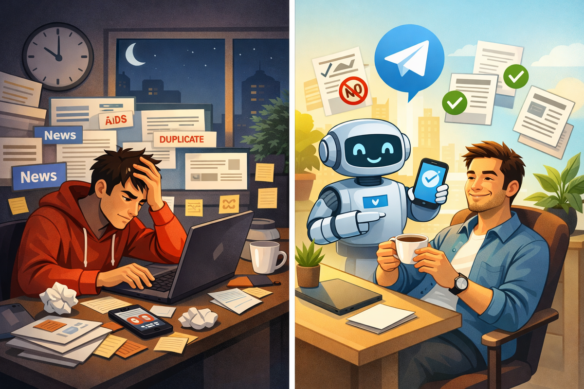Каждый раз одно и то же: надо вести Telegram-канал, а ты снова сидишь ночью и вручную ищешь новости, копируешь, чистишь, пытаешься «причесать» текст под стиль канала. В итоге — полдня уходит в никуда, посты выходят рывками, попадаются дубли, а иногда в ленту пролезает мусор и скрытая реклама. И самое обидное — ты тратишь время не на рост канала, а на бесконечный копипаст. Почему вручную так быстро всё ломается? Я сделал решение под это — TelegaPapa. Это бот для нейропостинга и бот для постинга новостей, который собирает материалы из источников, убирает мусор и рекламные вставки, проверяет повторы (антидубль), следит за свежестью и делает рерайт новостей для телеграм под стиль твоего канала. Дальше — публикация по расписанию телеграм, чтобы лента была ровной без твоих ночных смен. Сценарий “до/после” простой.