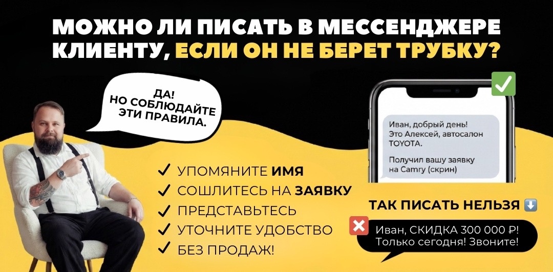 Короткий ответ: писать можно. И даже нужно (вспомните нашу статистику: 87% клиентов в автонише предпочитают переписку). Но при соблюдении нескольких важных условий.
