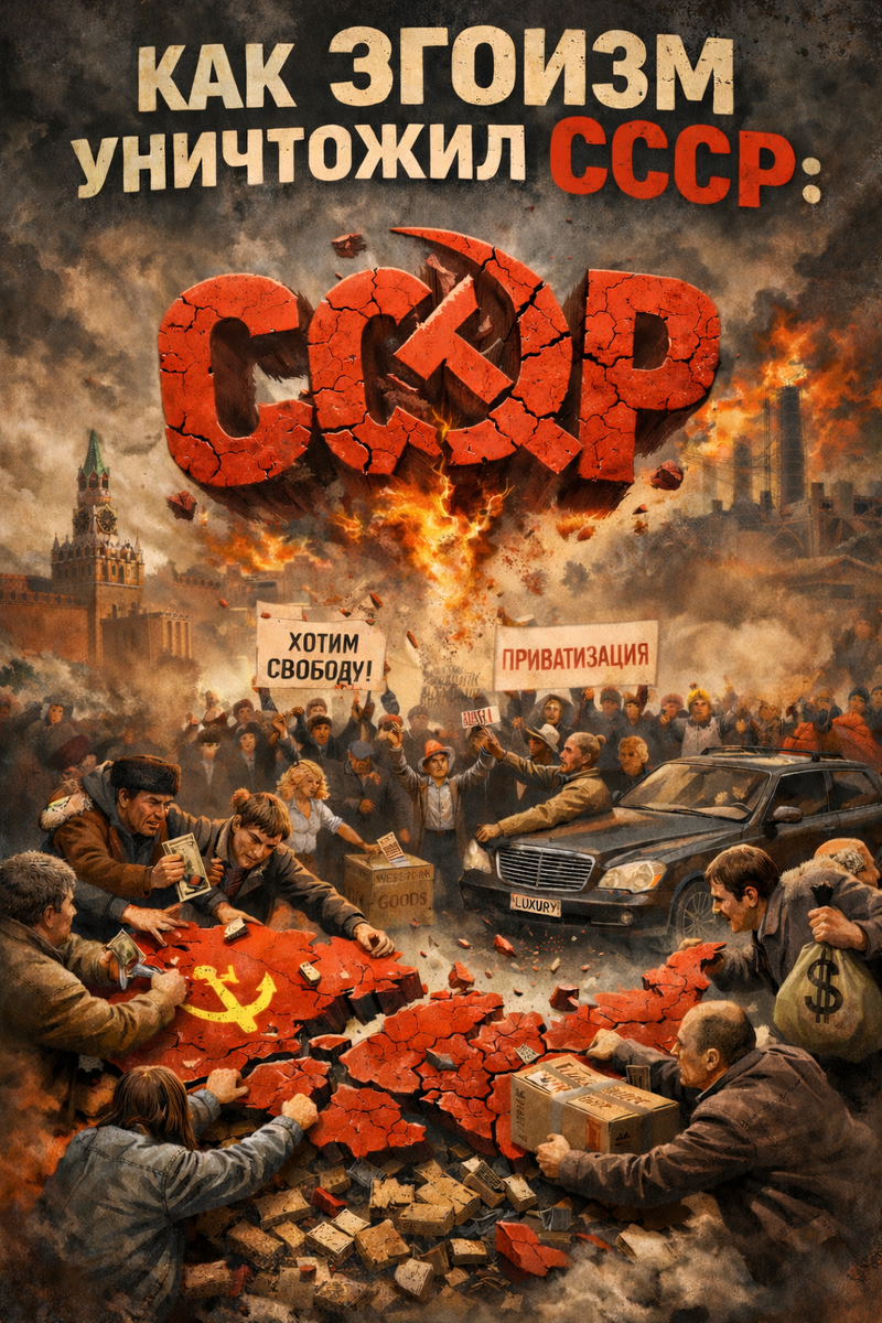 Историки и политологи до сих пор спорят о причинах краха "Красной империи". Одни винят "нефтяную иглу", другие — коварные планы западных спецслужб, третьи — экономическую неэффективность плановой системы. Но что, если мы посмотрим на эту трагедию под другим углом? Давайте на мгновение отложим в сторону цифры и геополитику и подумаем над версией, в которой главным и самым неумолимым разрушителем Союза стал обычный человеческий эгоизм. Это одна из тех теорий, которая объясняет крах не через внешние факторы, а через саму природу человека. Согласно этой версии, великий социальный эксперимент разбился не о дефицит, а о осознанный путь, который выбрало большинство людей, когда в решающий момент личный интерес оказался просто тяжелее коллективного будущего.
