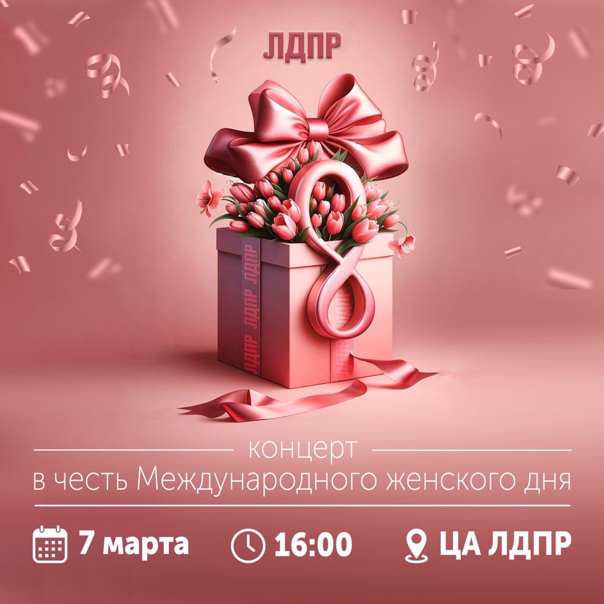 🔈Празднуем Международный женский день вместе! 🗓Ждём вас 7 марта на концерте: 📍1-й Басманный пер., 3, стр.1; 🔍 16:00. 👀В программе: талантливые артисты от продюсерского центра Лёли Хаммер, также наш фирменный чай и угощения для гостей! Зарегистрироваться можно по ссылке. "Дорогие женщины! Спасибо за ваш огромный труд — заботу о семье! ЛДПР борется за достойную зарплату и уверенность в завтрашнем дне для каждой из вас! Каждой женщине достаток!" — С уважением, лидер ЛДПР Леонид Слуцкий.