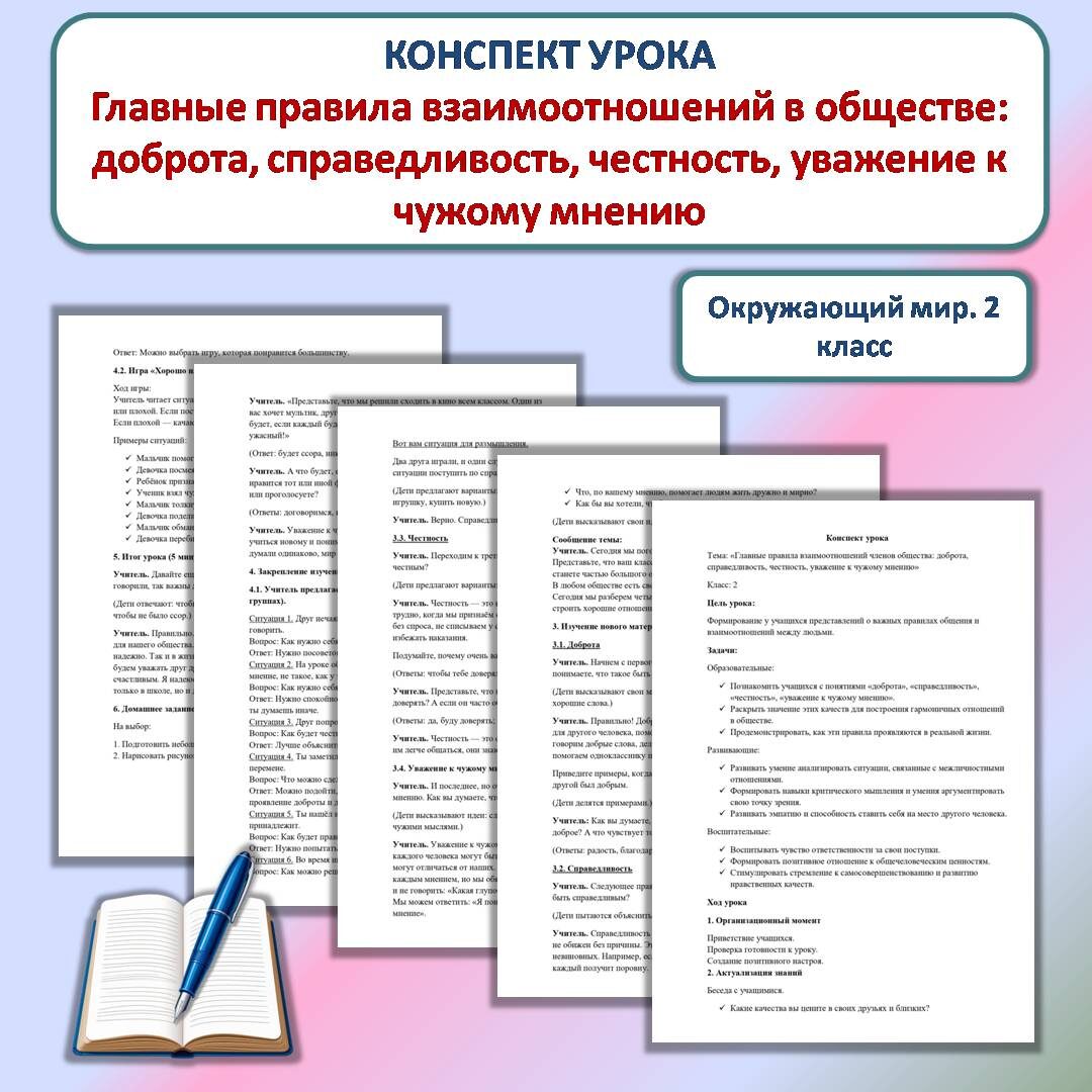 Конспект урока скачать здесь Конспект урока «Главные правила взаимоотношений в обществе: доброта, справедливость, честность, уважение к чужому мнению» разработан для урока окружающего мира во 2 классе. Задачи: В разработке предусмотрены следующие этапы урока: 1. Организационный момент 2. Актуализация знаний и подведение к теме урока 3. Сообщение темы и задач урока 4. Изучение нового материала (в форме беседы с учащимися) Что такое доброта? Что такое честность? Что такое справедливость? Что такое уважение к чужому мнению? 5. Закрепление изученного материала Практические задания: а) анализ ситуаций; б) Игра «Хорошо или плохо» 6. Итог урока 7. Домашнее задание на выбор Методическая ценность разработки заключается не только в её содержании, но и в доступности формулировок для младшего школьного возраста. Презентацию к уроку вы можете скачать здесь Желаю успеха!
