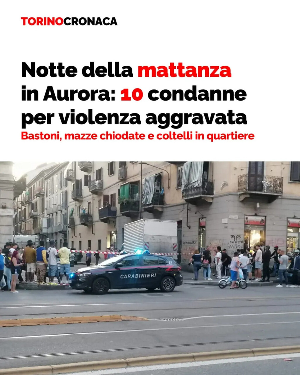 ✅ СПРАВКА: Эта новость переведена и размещена при помощи искусственного интеллекта Chat GPT без участия человека, в случае если вы заметили ошибку, или новость не соответствует реальному событию — сигнализируйте, исправим. 👉 Искренне Ваш Сержио Боттичелли: https://www.facebook.com/mercator.cz __________________ Туринский суд осудил десять человек за жестокую драку, произошедшую 28 мая 2025 года в районе Аурора, на перекрестке улицы Бра и корсо Джулио Чезаре. Самый высокий срок — 5 лет и 10 месяцев, самый низкий — 1 год и 5 месяцев, все сокращены на треть благодаря сокращенной процедуре. В тот день два соперничающих группировки, в основном перуанского происхождения, столкнулись на улице с палками, битами с гвоздями, ножами и автомобилями, использованными в качестве оружия. Четыре человека были госпитализированы с серьезными, но не угрожающими жизни, травмами. Жестокость, которую местные жители охарактеризовали как "мексиканскую резню", была зафиксирована на видео и разошлась по соци