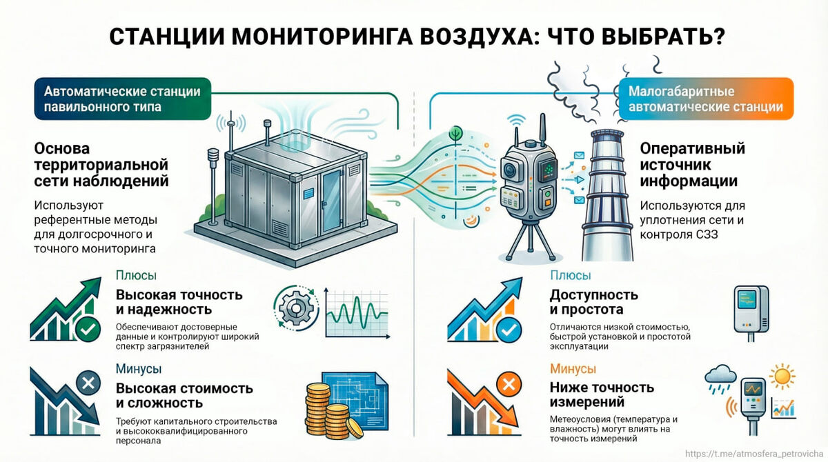 Разберемся чем отличаются друг от друга павильонные и малогабаритные автоматические станциями контроля загрязнения атмосферы. 🔵 Автоматические станции павильонного типа Это стационарные посты, оснащённые оборудованием, использующим референтные методы измерений. Служат основой территориальной сети наблюдений, одобрены к применению Росгидрометом. Их используют для долгосрочного мониторинга и оценки годовых, а также динамики многолетних уровней загрязнения. 🟢 Малогабаритные автоматические станции Компактные станции - сравнительно новый класс решений, получивший широкое распространение в мире и в России за последние 10 лет. Они используют, как правило, альтернативные методы измерений (электрохимические, оптические и др.). Применяются в системах регионального мониторинга для ликвидации белых пятен на карте и предприятиями, служат важным источником оперативной информации о качестве воздуха. С моей точки зрения эти два типа станций - не конкуренты, а взаимодополняющие элементы единой систе
