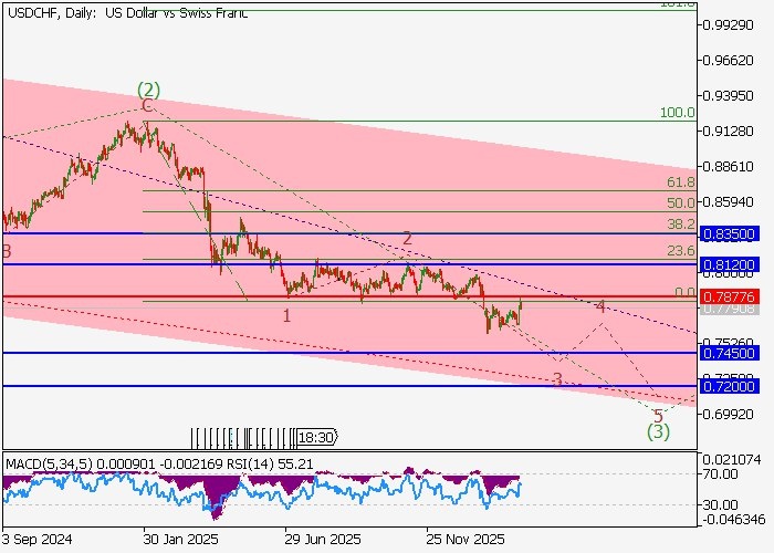 USD/CHF: волновой анализ Вероятность снижения сохраняется. На дневном графике продолжается развитие нисходящей третьей волны старшего уровня (3) of 5, в составе которой сформировалась первая волна младшего уровня 1 of (3) и окончена коррекция в качестве второй волны 2 of (3), а также образуется третья волна 3 of (3). На четырёхчасовом временном интервале идёт развитие волны iii of 3, а также близится к окончанию локальная коррекция в качестве волны (iv) of iii. Если предположение верно, нисходящая динамика пары USD/CHF усилится в район 0.7450–0.7200, а критическим уровнем стоп-лосса для данного сценария станет 0.7877. Срок реализации: 7 дней. До 12.03.2026 Рекомендация: SELL Цена входа: 0.7818 Тейк профит: 0.7450, 0.7200 Стоп Лосс: 0.7877 Ключевые уровни: 0.7200, 0.7450, 0.7877, 0.8120, 0.8350 ID прогноза: 285